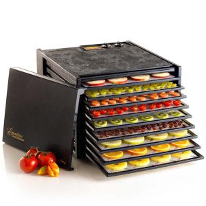 The items of food are placed on the multiple shelves within the unit, and air is heated and moved throughout the machine over a period of time. The time it takes varies and depends on the food item you’re dehydrating, it may take a little experimentation to get it right.